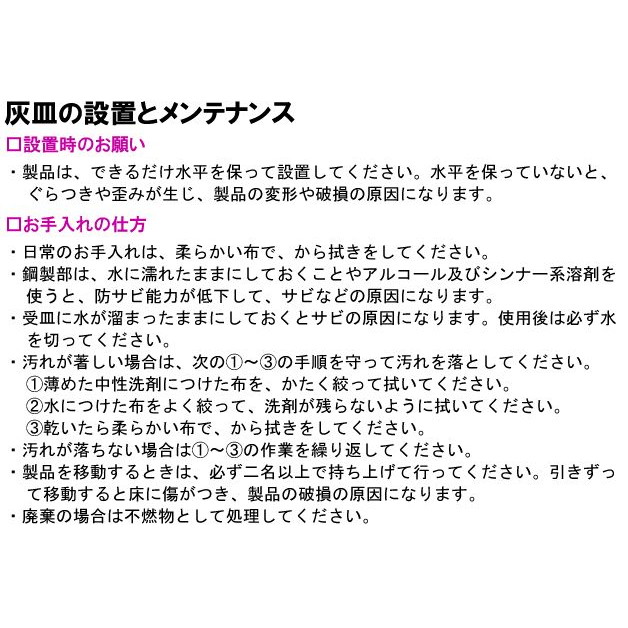 | 備考 | ・受皿には消火用の水を溜めてご利用ください。 ・商品の色はPCと異なって見える場合があり、またPCによっても異なります。色がイメージと異なるという理由では返品は承りかねますので、予めご了承ください。 |